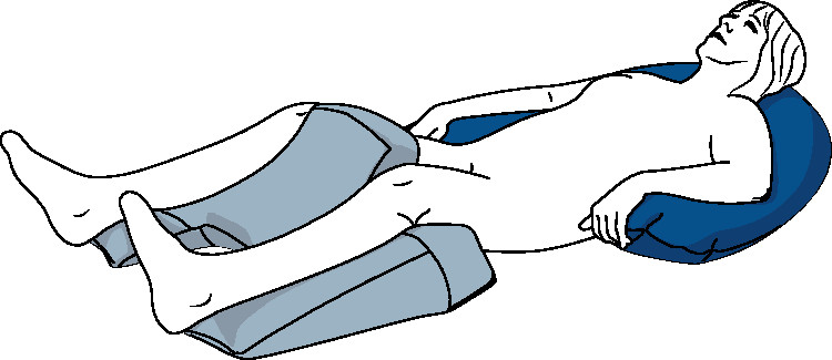 Wird das Lagerungskissen in Rückenlage um 180° zu der vorher beschriebenen Lagerung gedreht und mittig unter den Oberschenkeln platziert, erreicht man eine Entlastung im Gesäß- und Kreuzbeinbereich sowie eine Unterfütterung des Kniebereiches. Dies dient vorrangig der Entlastung von Sehnen und Bänder im Bereich der unteren Extremitäten. Zusätzlich ermöglicht diese Anwendung eine leicht erhöhte Armlagerung.
