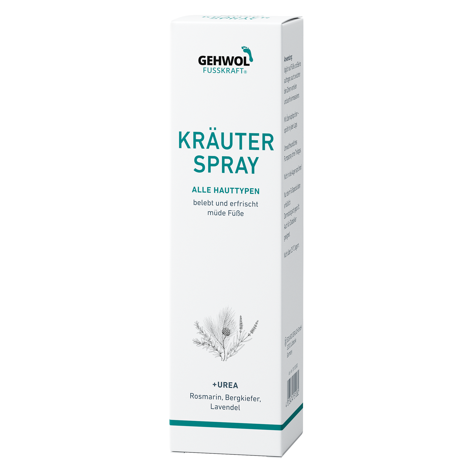 Das Fusskraft Kräuterspray von Gehwol ist eine erfrischende und kühlende Pflege an heißen Sommertagen gegen müde und schwere Füße. Das Spray enthält natürliche ätherische Öle aus Lavendel, Bergkiefer und Rosmarin, welches entzündungshemmend, antibakteriell und langanhaltend desodorierend wirken. Zusätzlich kühlt das enthaltene Menthol die Haut, lindert Juckreiz und beugt Fußpilz vor. Für besonders gepflegte Füße enthält die Kräuterspray hautpflegende Stoffe wie Urea, Bisabolol und Panthenol. Diese sorgen für eine weiche Haut und machen harte Hornhaut wieder geschmeidig. Das Produkt kann dank einem Überkopfsprüher einfach auf die Füße, Fersen und Zehenzwischenräume in jeder Lage aufgesprüht werden.