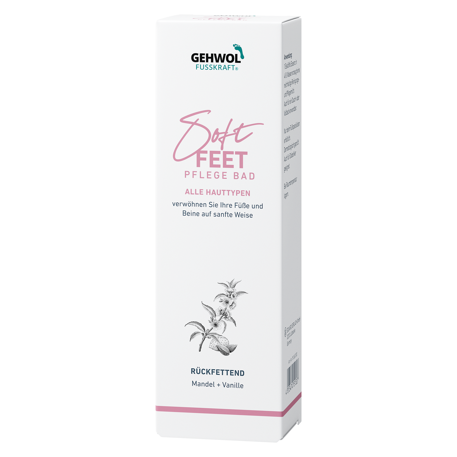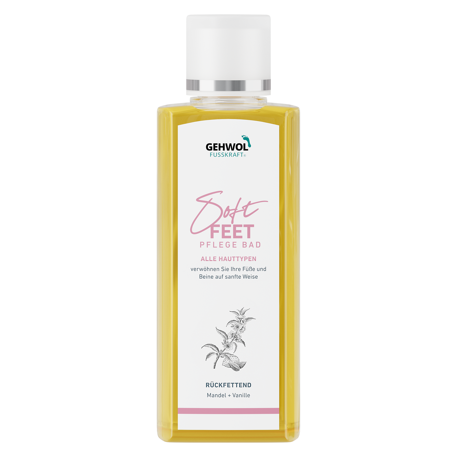 Gehwol Fusskraft Soft Feet Pflegebad verwöhnt Füße und Beine mit einem unvergesslichen Badeerlebnis. Eintauchen und sanft entspannen! Nach nur einem Bad fühlt sich Ihre Haut wunderbar zart an. Das Bad eignet sich für jeden Hauttyp, vor allem für trockene und sensible Haut. Die Essenz enthält einzigartige Wirkstoffe, die das Bad in eine reichhaltige Reinigungs- und Pflegemilch verwandeln. Mandelöl beruhigt die Haut, macht sie schön weich und gibt ihr Schutz. Hinzu kommt verführerische Vanille, die zusammen mit Vitamin E sowie Pflegeölen aus Avocado und Rizinus viel Feuchtigkeit spendet, Hornhaut erweicht und ein glattes, vitales Hautbild hervorzaubert.