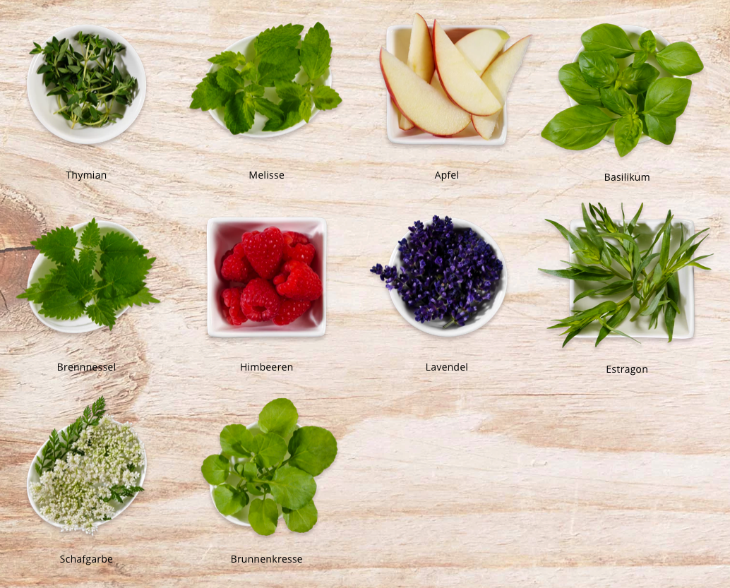 - Thymian, Zimtrinde, Melissenblätter, Lemongras, Zitronenschalen, Liebstockwurzel, Majorankraut, Quendelkraut, Spitzwegerichkraut, Weinblätter, Ysopkraut, Zitronenverbenenblätter, Apfel, Artischockenkraut, Bärlauchkraut, Buchweizenkraut, Fenchelfrüchte - süß, Kreuzkümmel, Lindenblüten silber, Rosmarinblätter, Süßholzwurzel, Anisfrüchte, Basilikumblätter, Hagebuttenschalen, Lavendelblüten, Lungenkraut, Bohnenkraut, Erdbeerblätter, Eukalyptusblätter, Holunderblüten, Johannisbeerblätter, Koriander, Kümmelfrüchte, Löwenzahnblätter, Orangenschalen, Hopfenblüten, Brennnesselblätter, Brombeerblätter, Dillfrüchte, Heidelbeerblätter, Hibiskusblüten, Himbeerblätter, Ingwerwurzel, Kardamom, Ringelblumenblüten, Estragonblätter, Dillkraut, Heidelbeerfrüchte, Rosenblütenblätter - rosa