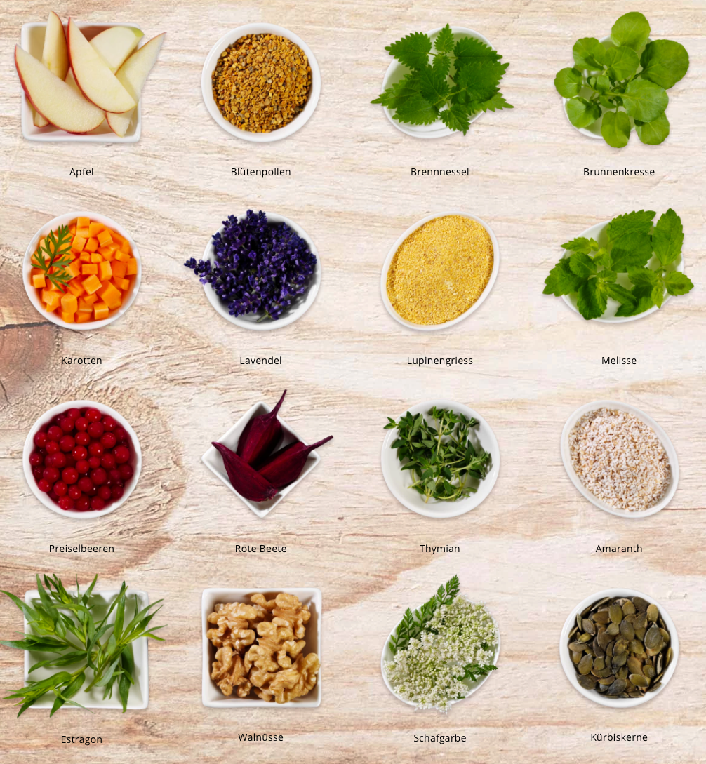 - Früchte 25,8 % (Apfel, Mango, Ananas, Heidelbeeren, Acerolakirschen, Orangen, Preiselbeeren, Brombeeren, Aprikosen, Orangenschalen, Cranberries, Zitronenschalen), Blütenpollen 17 %, Kürbiskerne, Lupinen, Sonnenblumenkerne, Erdmandeln, Süße Mandeln, Kräuter 4,8 % (Süßholzwurzel, Löwenzahnkraut, Hopfenblüten, Buchweizenkraut, Galgantwurzel, Bärlauchkraut, Brennnesselblätter, Flohsamen, Liebstöckelblätter, Rosmarinblätter, Thymian, Ysopkraut, Estragonblätter, Eukalyptusblätter, Melissenblätter, Schachtelhalmkraut, Schafgarbenkraut, Weinblätter grün, Artischockenkraut, Basilikum, Bohnenkraut, Brunnenkresse, Dillspitzen, Zitronenverbenenblätter, Holunderblüten, Johannisbeerblätter, Lavendelblüten, Lindenblätter, Lindenblüten silber, Lungenkraut, Melissenkraut, Orangenblätter, Quendelkraut, Brennnesselkraut, Brombeerblätter, Erdbeerblätter, Himbeerblätter, Kapuzinerkressekraut, Lemongras, Maishaare, Majoran, Rosenblütenblätter rosa, Sellerieblätter, Tausendgüldenkraut, Kerbelblätter), Gemüse 2,8 % (Rote Bete, Kohlblätter, Linsen rot, Karotten, Rettich schwarz, Zucchini, Spargel, Kichererbsen, Bohnen, Brokkoli, Meerrettichwurzel, Spinat, Zwiebeln), Buchweizen, Hirse, Walnüsse, Gewürze, Topinambur, Amarant, Hagebutten, Dillfrüchte, Granatapfelkerne, Pistazien