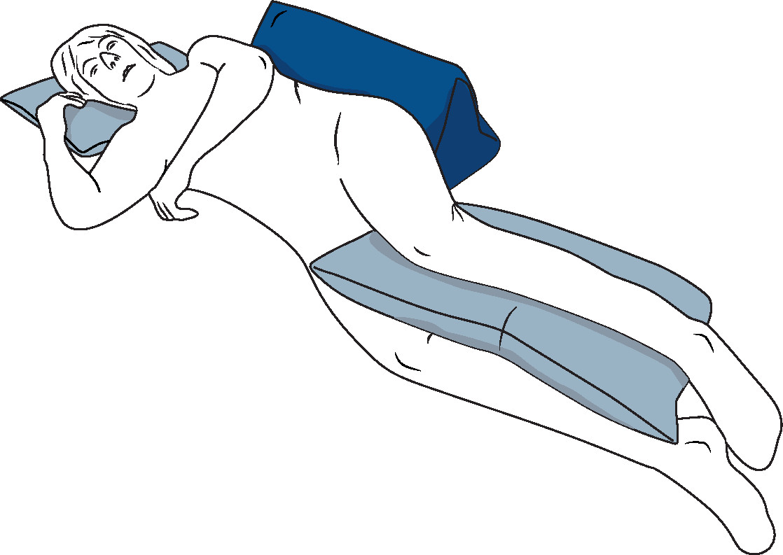 Dabei wird das Kissen in der seitlichen Positionierung direkt an den abzustützenden Regionen Schulter, Rücken oder Becken platziert. Aufgrund der breiten Unterseite des Delta-Kissens sowie der rutschhemmenden Eigenschaft der Hülle, gewährleistet es eine gute Lagestabilität für den Patienten.