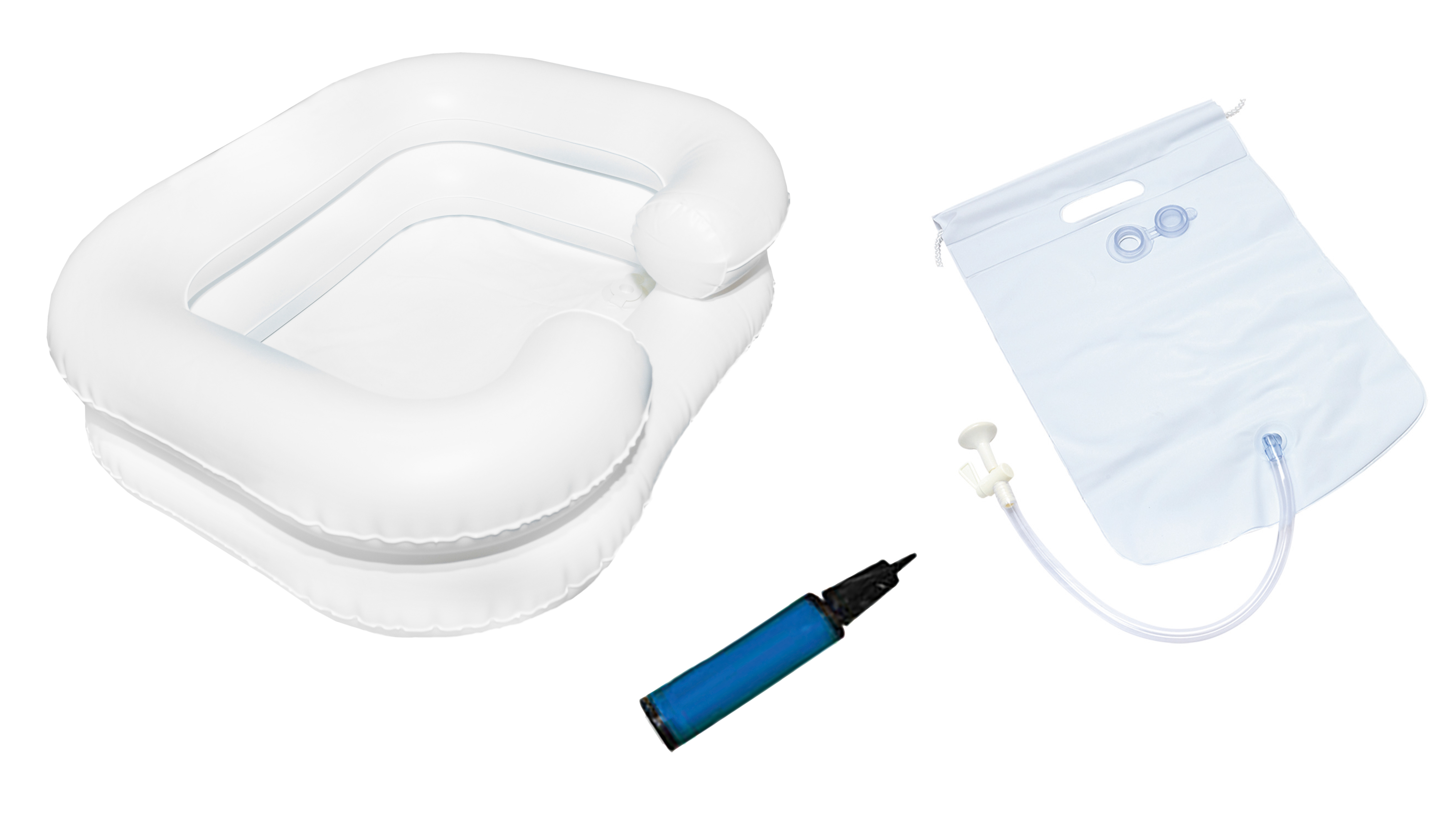 Das Haarwaschbecken Set besteht aus einer aufblasbaren Haarwaschwanne, einer Pumpe und einer Duschvorrichtung. Mit diesem Set sind sie perfekt ausgestatte um dem bettlägerigen Patienten eine wohltuende Haarpflege zukommen zu lassen. Der Patient muss dafür nicht aus dem Bett bewegt werden. Das Kopfwaschwannen Set ist eine perfekte Hilfe bei der pflegegerechten Körperhygiene. Das aufblasbare, rechteckige Haarwaschbecken besitzt eine kleine Kopfmulde für bequemes Liegen und ist mit einem absperrbaren Wasserablauf versehen. Die wasserbefüllte Duschvorrichtung wird oberhalb des Patienten angehängt. Sie hat einen integrierten Absperrhahn und dient zur Befeuchtung der Haare. Die Haarwaschwanne ist leicht und lässt sich gut transportieren, was den Pflegediensten und Einrichtungen auch entgegen kommt.