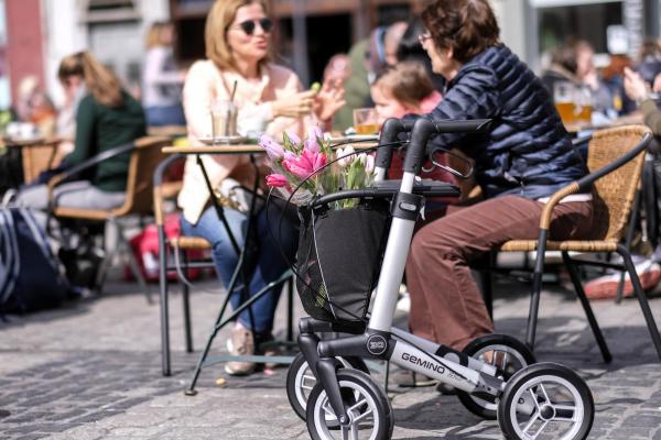 Der Gemino30 Comfort von Sunrise Medical ist ein leichter Rollator, der für die Nutzung im Innen- und Außenbereich entwickelt wurde. Der Rollator überzeugt mit seinen großen, weichen, stoßdämpfenden Rädern, mit denen leicht sowohl Bordsteinkanten als auch Türschwellen überwunden werden können und auch ein sicheres Gehen in unebenem Gelände, wie z.B. auf Waldboden möglich ist. Durch die anatomisch geformten Handgriffe ist das Führen des Gelände Rollators auch über Langzeit sehr angenehm, da der Druck auf die Sehnen, Bänder und Gelenke minimiert wird. Damit der Rollator optimal zu seinem Benutzer passt, können die Schiebegriffe werkzeuglos mit Hilfe der Skala und einer Höhenverstellung mit Memory-Funktion an die Körpergröße angepasst werden. Zum Verstauen von persönlichen Dingen und Einkäufen eignet sich die mitgelieferte Tasche, welche bis zu 10 kg transportieren kann. Bei Nichtgebrauch kann der Gemino30 Comfort durch das patentierte Falt-Klick-System platzsparend verstaut werden. Er steht auch im gefalteten zustand. Für mehr Sicherheit bei schlechten Wetterverhältnissen oder im Dunkeln besitzt der Comfort Rollator an der Seite und der Frontpartie Reflektoren. Ankipphilfen mit Reflektoren sind ebenfalls beidseits vorhanden.