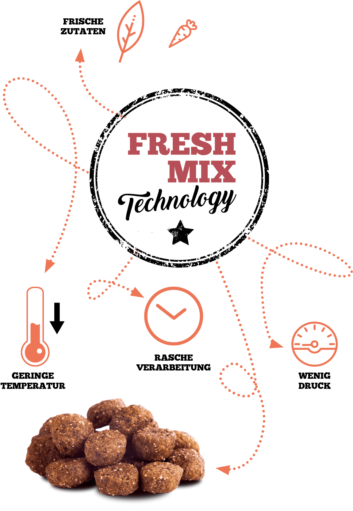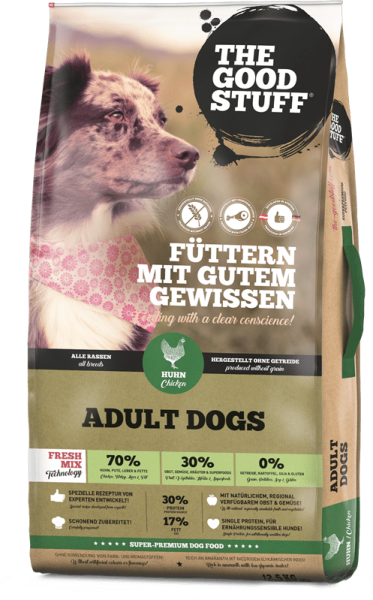 Das Premium Trockenfutter von The GoodStuff ist ein ideales Alleinfuttermittel für Hunde aller Rassen und Größen mit normaler Aktivität. Das Fütterungsmittel wird schonend hergestellt ohne Getreide, reich an frischem Hühner- und Puten-Muskelfleisch in Lebensmittelqualität, Amaranth mit niedrigem glykämischen Index, regional verfügbarem Obst und Gemüse sowie ausgewählten Kräutern. Die Rezeptur enthält Single Protein und wurde nach der Fresh-Mix-Methode hergestellt. Höchstes Augenmerk legt The GoodStuff auf schonende Produktionsmethoden, damit die Hunde ein Maximum an Nährstoffen aus unseren besonders hochwertigen und frischen Zutaten erhalten. Das schonende Produktionsverfahren – die so genannte Fresh-Mix Methode – garantiert, dass sämtliche Zutaten weder Druck oder zu hoher Reibung, noch übermäßiger Hitze ausgesetzt sind und die Nährstoffe so bestmöglich erhalten bleiben.