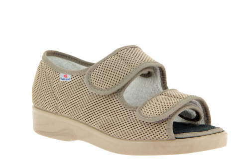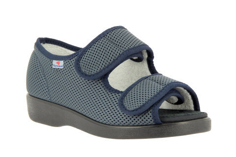 Dieser Verbandschuh von Varomed ist durch seine langen Klettschlaufen und den großen Einstieg sehr variabel. Die Gesundheitsschuhe in Sandalenform hat innen eine 6 mm hohe Weichschaumeinlage mit Frotteebezug und eine Fersenkappe. Pflegebedürftige Menschen und deren Betreuer schätzen vor allem die einfache Handhabung bei diesem Schuh. Eine weite Öffnungsmöglichkeit ermöglicht einen problemlosen, einfachen Einstieg in die Verbandschuhe. Die praktische Verschlusslösung mit der stufenlosen Weitenregulierung durch Klettverschlüsse mit großen Griffplatten sind dafür der Grund. Beides ermöglicht ein großes Aufnahmevolumen für Verbände, Wickelungen, Bandagen oder stark geschwollene Füße. Die gute Fersenführung dank einer geformten Hinterkappe bietet dem Nutzer einen sicheren Halt. Die Varomed Verbandschuhe sind sowohl für den Innen - als auch den Aussenbereich geeignet. Die Laufsohle ist zusätzlich schleifbar und orthopädisch zurichtbar. Sie hat eine extrabreite, sichere Auftrittfläche.